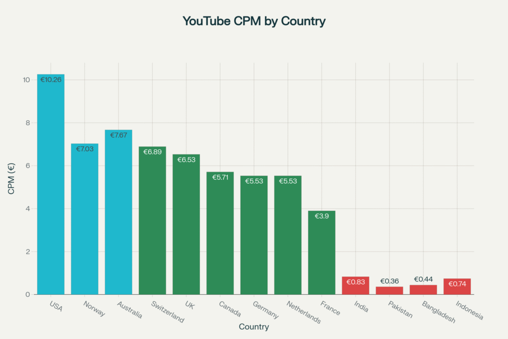 CPM disparities: YouTube ad rates vary sharply by country – e.g. ~€0.83 in India vs €10.26 in the US – meaning a creator’s baseline revenue is much lower outside top markets.
