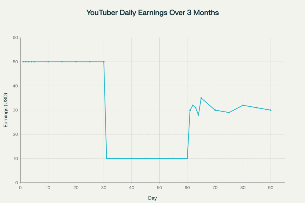 Another way to present data is through an earnings timeline. For instance, a real YouTuber’s dashboard might show consistent daily earnings in January, then a precipitous drop in February, and partial recovery in March. Plotting this, one sees a jagged anomaly that defies content factors. Reddit graphs drawn by affected creators often reveal exactly this pattern. Such visuals have been shared in forums to illustrate “YouTube’s broken payout schedule.”